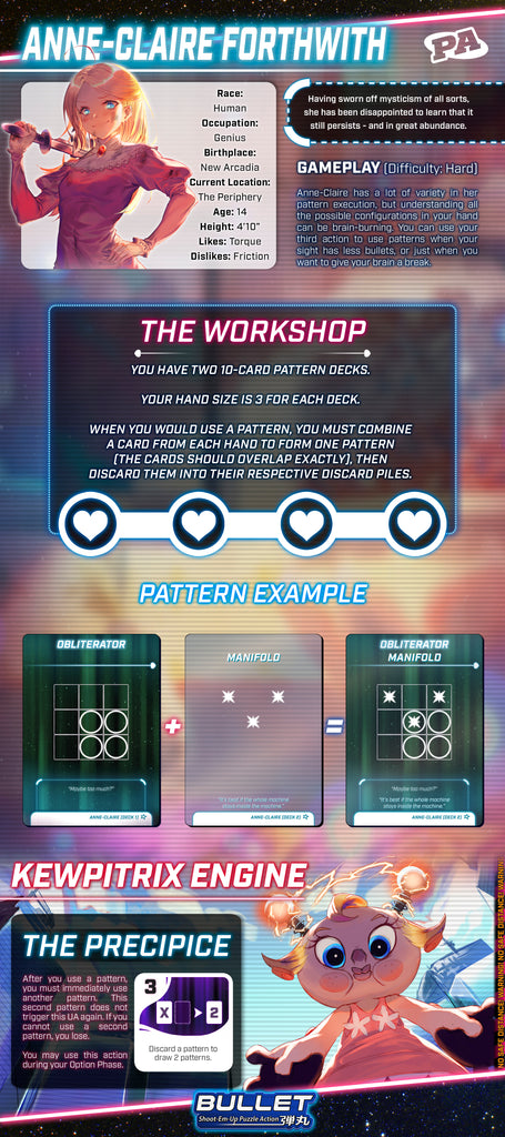 Penny Arcade's Mechanically-Inclined Niece enters the bullet hell! With her workshop, Anne-Claire Forthwith fuses two patterns together to create the right tool for every situation! As a Boss, Anne-Claire summons the Kewpitrix Engine, a giant doll automaton that forces Heroines to play 2 patterns at the same time or lose instantly!