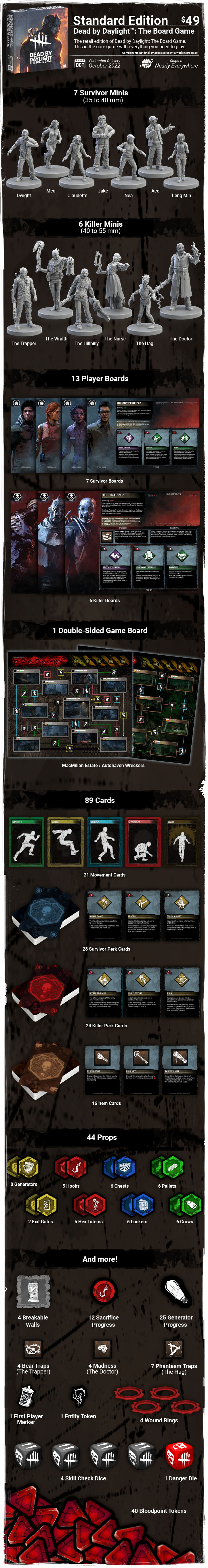 The hit asymmetric survival horror game comes to tabletop! Take on the role of a ruthless Killer or a resourceful Survivor as you navigate sinister trials.